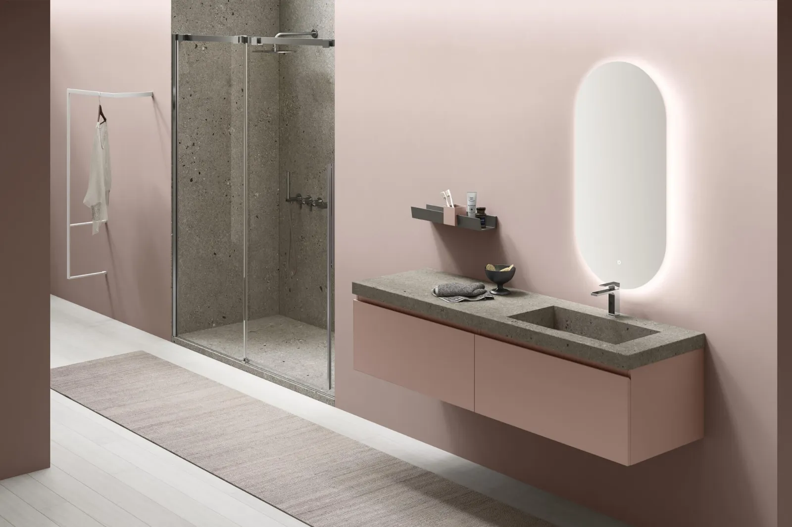 Arreda la stanza del benessere moderno perfettamente con Slash 03, mobili bagno sospesi e oggetti in laccato opaco di Arcom.
